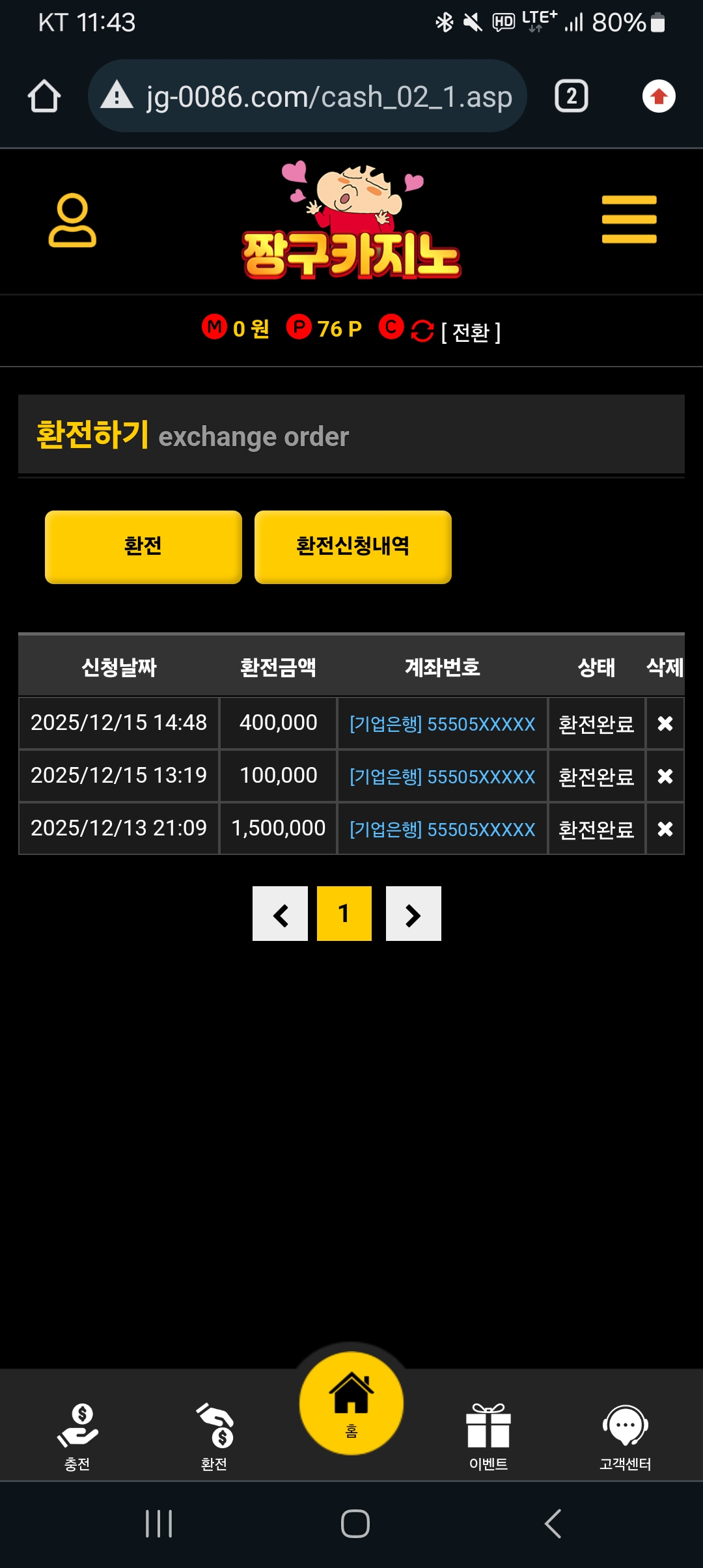 사이트 금지게임도 없고 돌발이벤트 자주 하고 지금까지 써본 사이트중에 최고입니다! 환전 충전 다 빠르고 매주 월요일에 페이백이벤트도 하니 많이 이용해 보세요!